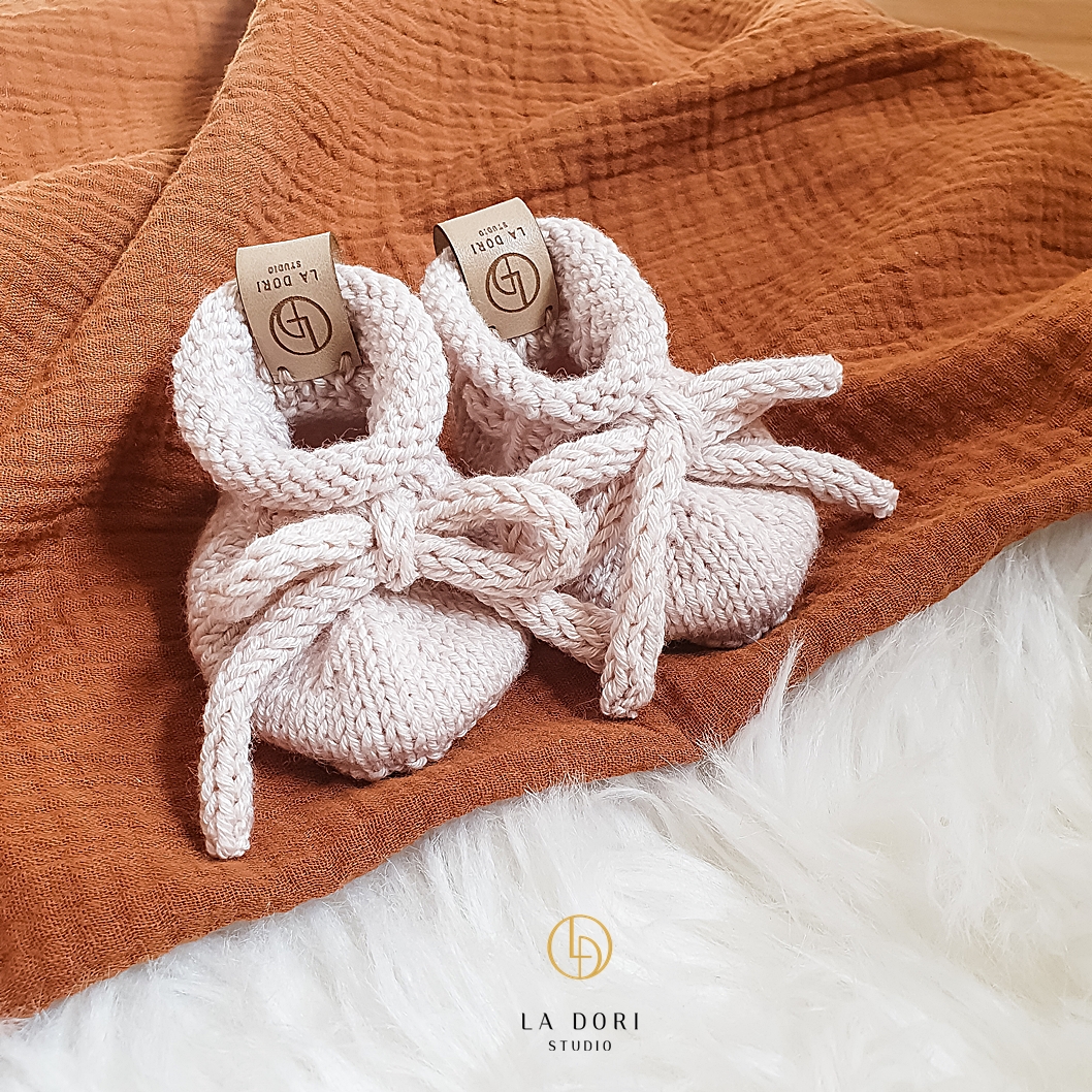 Cudowne, mięciutkie buciki na maleńkie stópki. Wykonane RĘCZNIE z NATURALNEJ przędzy. Idealnie trzymają się na stopie dzięki sznureczkom i nie spadają.