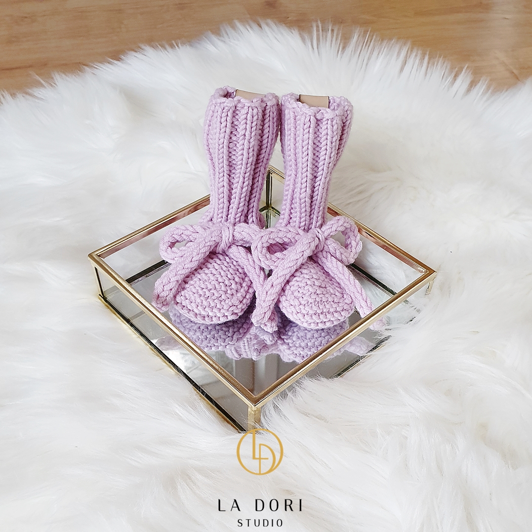 Urocze, mięciutkie i bardzo ciepłe buciki na maleńkie stópki. Wykonane RĘCZNIE z NATURALNEJ wełny MERINO. Idealnie utrzymują ciepło, a dzięki sznureczkom dobrze trzymają się na stopie i nie spadają. Można nosić na dwa sposoby: z wywiniętym mankietem lub prosto jak na zdjęciach.