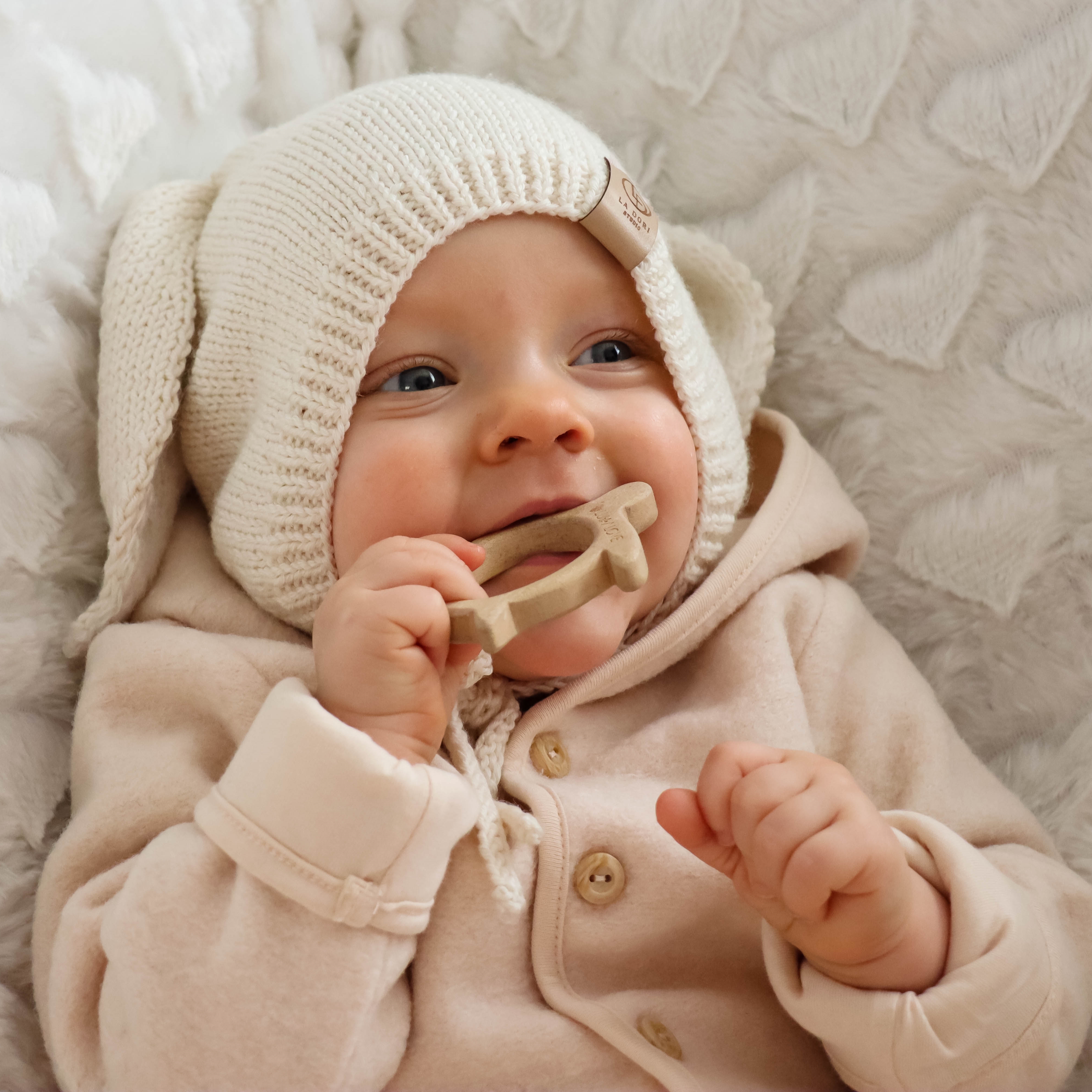 Ręcznie dziergana bonetka z uszami królika, która doda uroku każdej stylizacji. Łatwa do zakładania, dobrze chroni uszy dziecka. Wykonana z naturalnej przędzy.