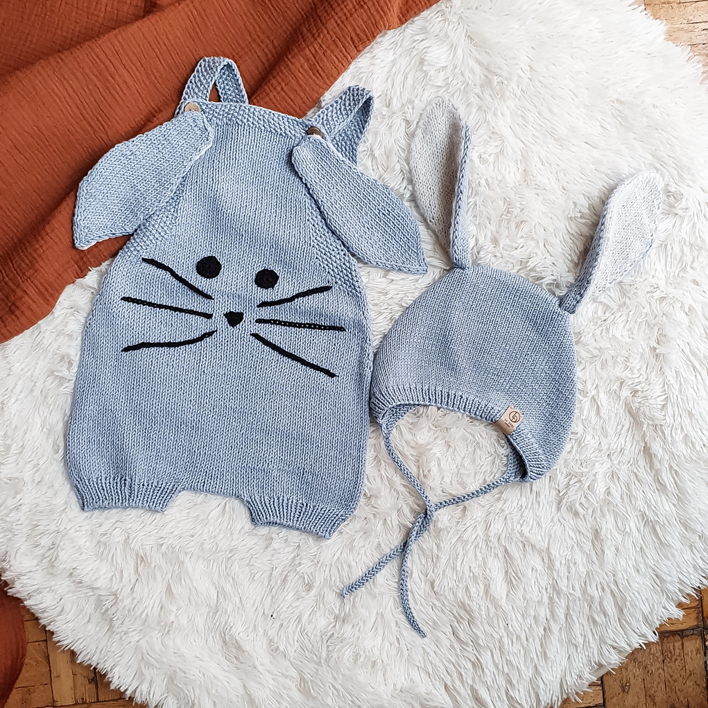 Zabawny, wygodny i multifunkcyjny króliczy romper wykonany ręcznie z naturalnej przędzy. Szelki regulowane dwoma drewnianymi guziczkami. Uszka odpinane. Można nosić tyłem lub przodem, z uszami lub bez - jak kto woli ;)
