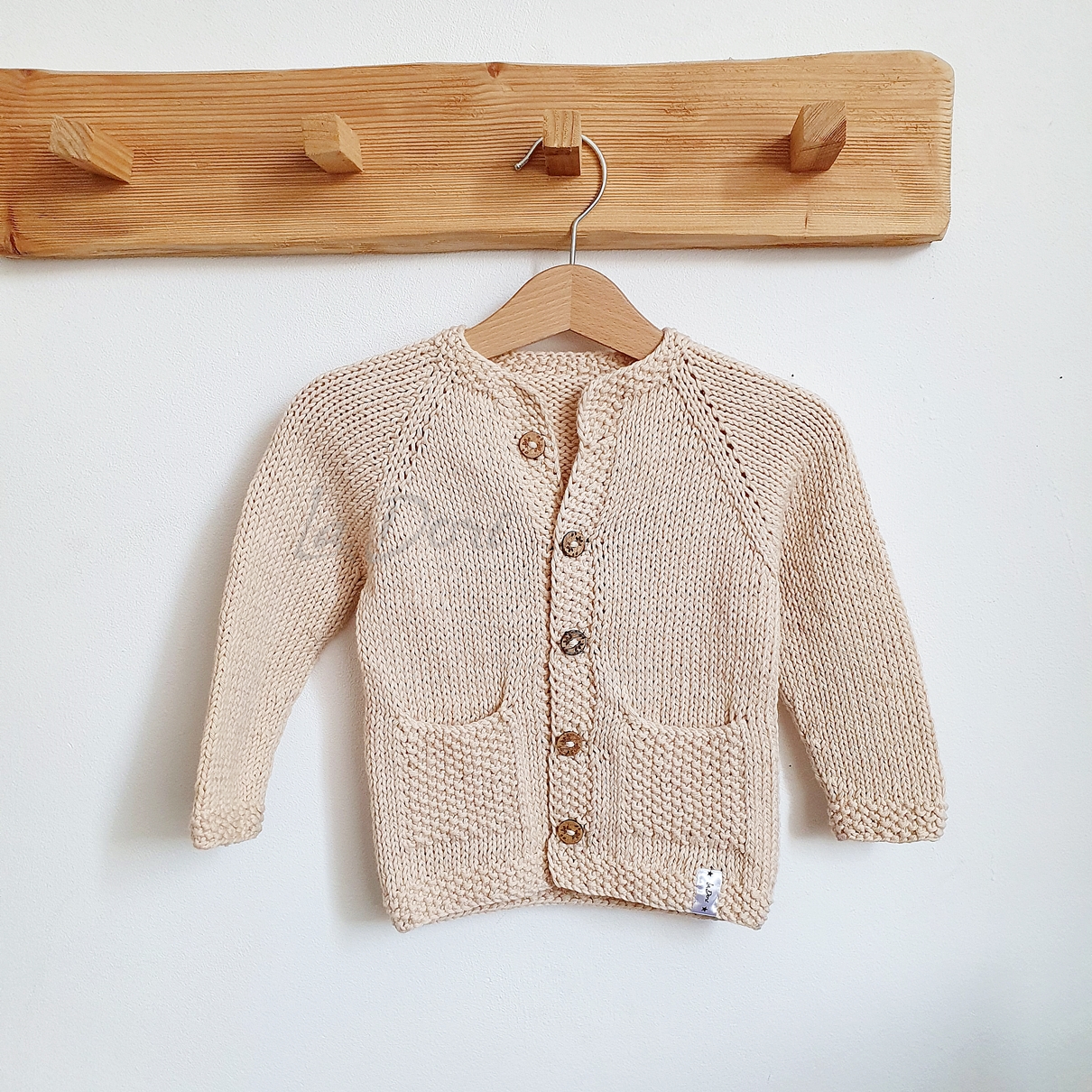 Rozpinany sweterek z kieszonkami wykonany ręcznie z naturalnej bawełnianej włóczki. Mięsisty i bardzo wygodny. Sprawdzi się o każdej porze roku. Drewniane guziczki dopełniają całość i dodają uroku.
