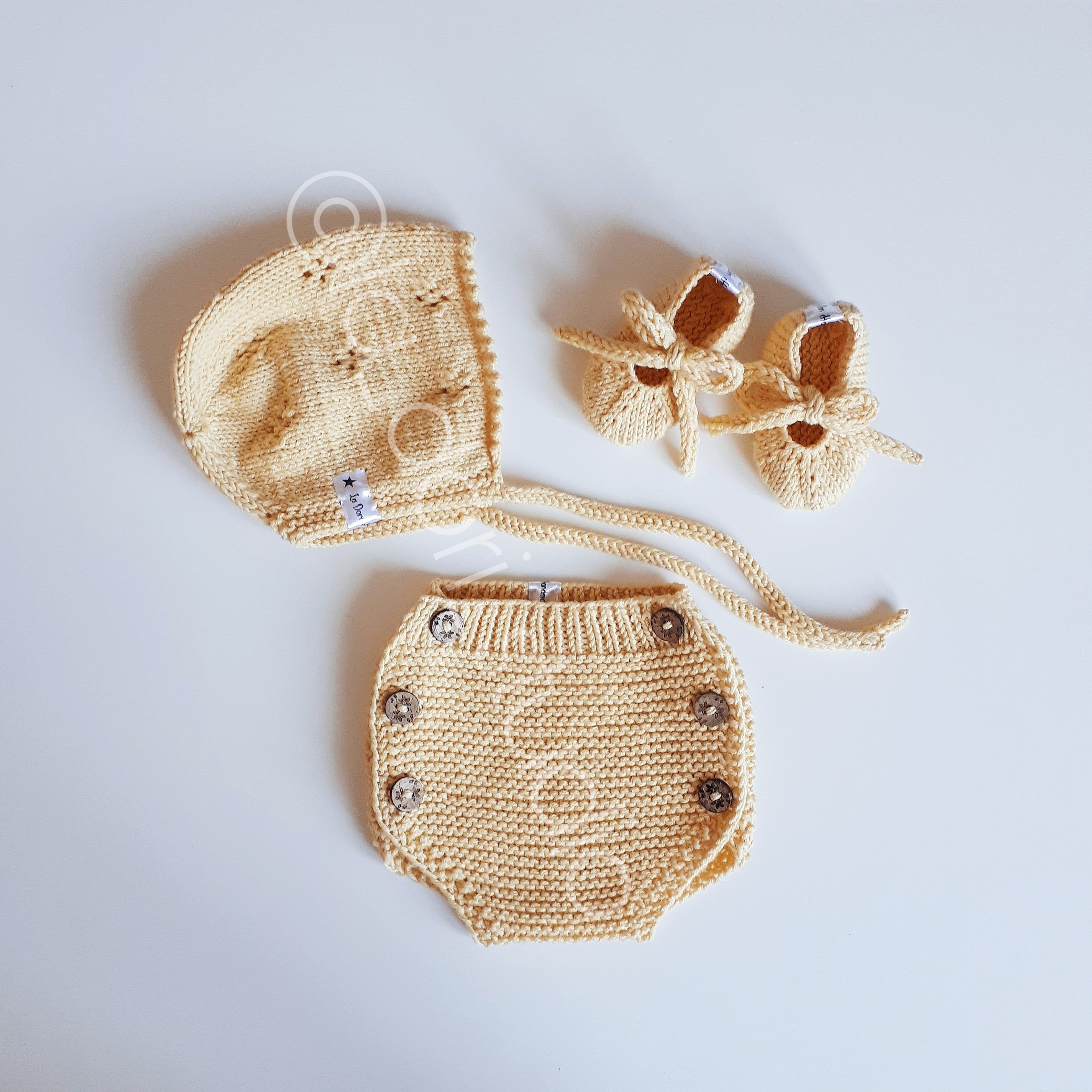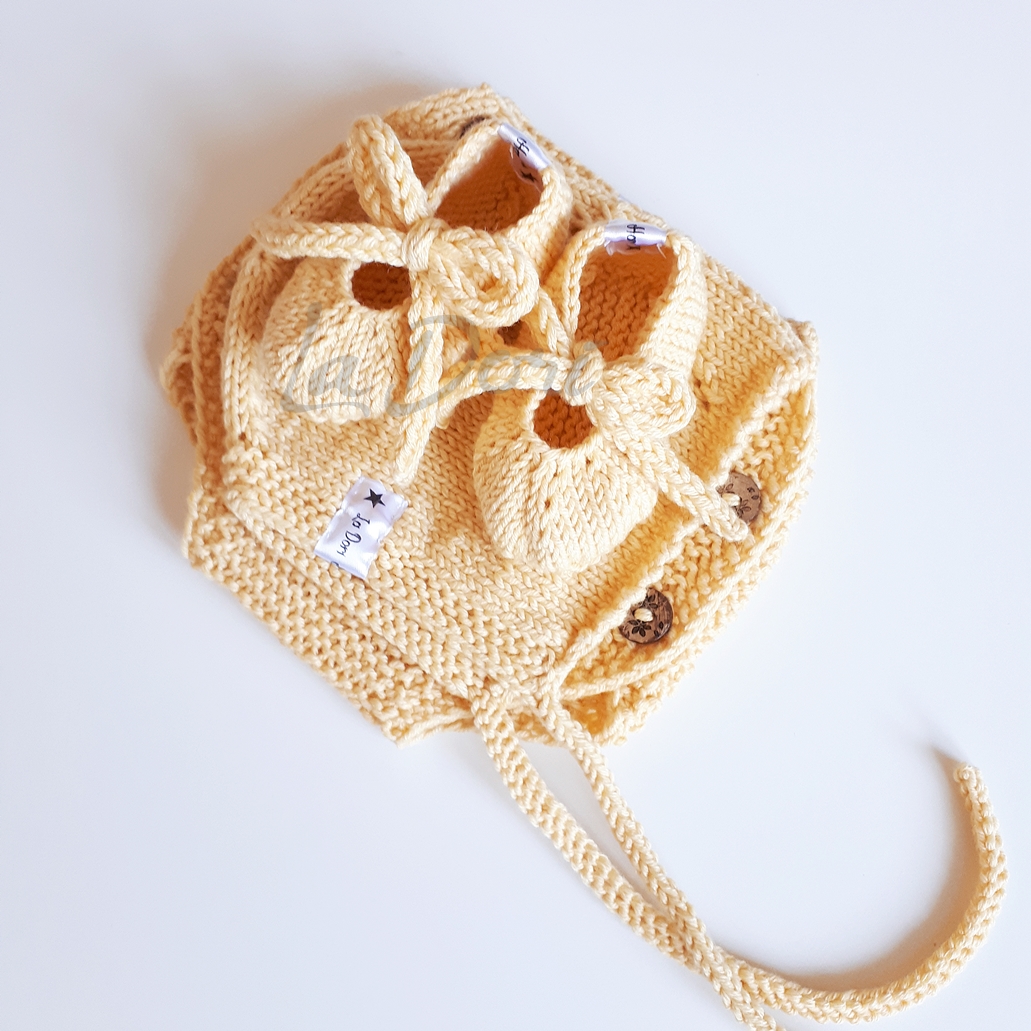 Mięciutkie dziergane buciki na małe stópki. Wykonane z naturalnej włóczki idealnie się dopasowują i dopełnią stylizację :)