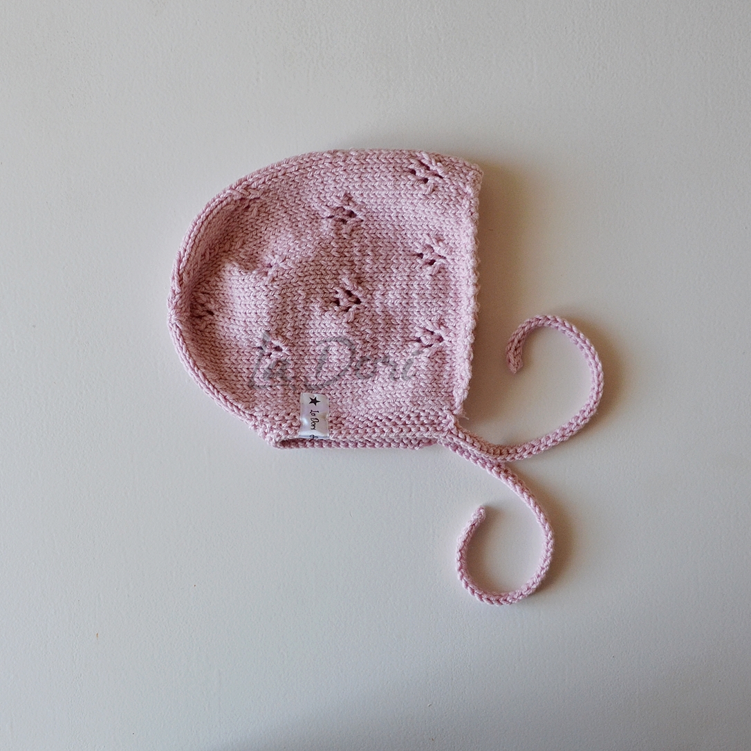 Cudowna bonetka z delikatnym ażurowym wzorem i pięknym wykończeniem. Idealna do otulenia małej główki na wiosennych i jesiennych spacerach. Wykonana z naturalnej przędzy i z ogromną precyzją.