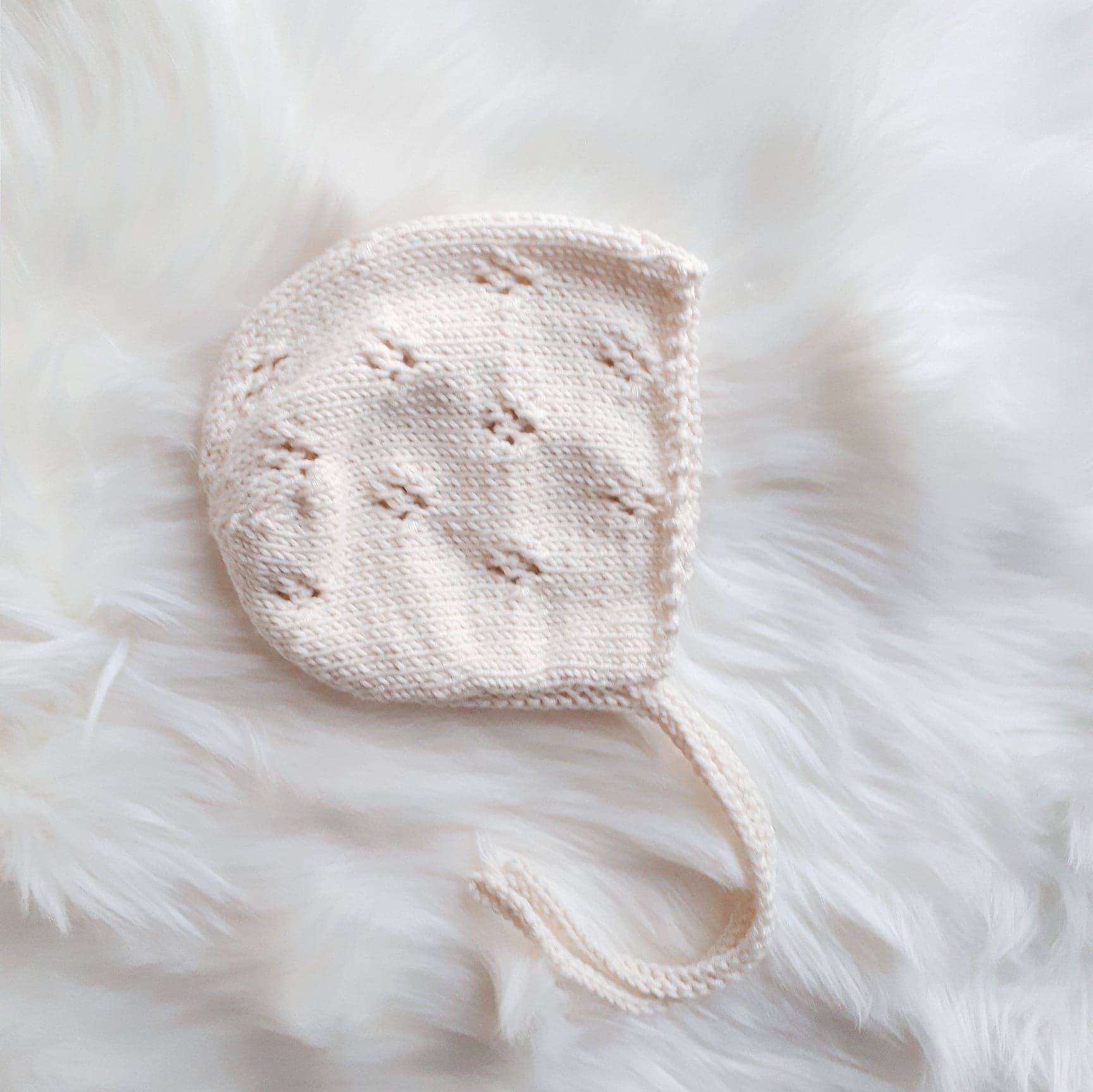 Cudowna bonetka z delikatnym ażurowym wzorem i pięknym wykończeniem. Idealna do otulenia małej główki na wiosennych i jesiennych spacerach. Wykonana z naturalnej przędzy i z ogromną precyzją.