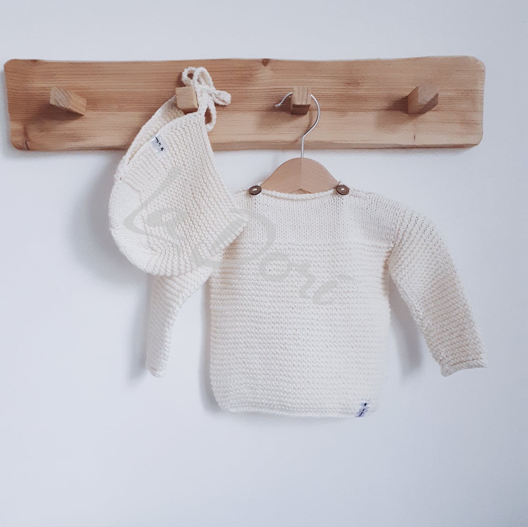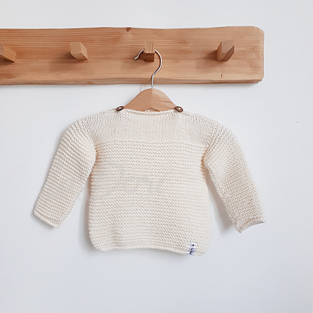 Delikatny sweterek o prostym, ponadczasowym fasonie. Ozdobiony drewnianymi guziczkami. Świetnie sprawdzi się o każdej porze roku, ponieważ jest wykonany z naturalnej przędzy: 50% bawełna i 50% merino.